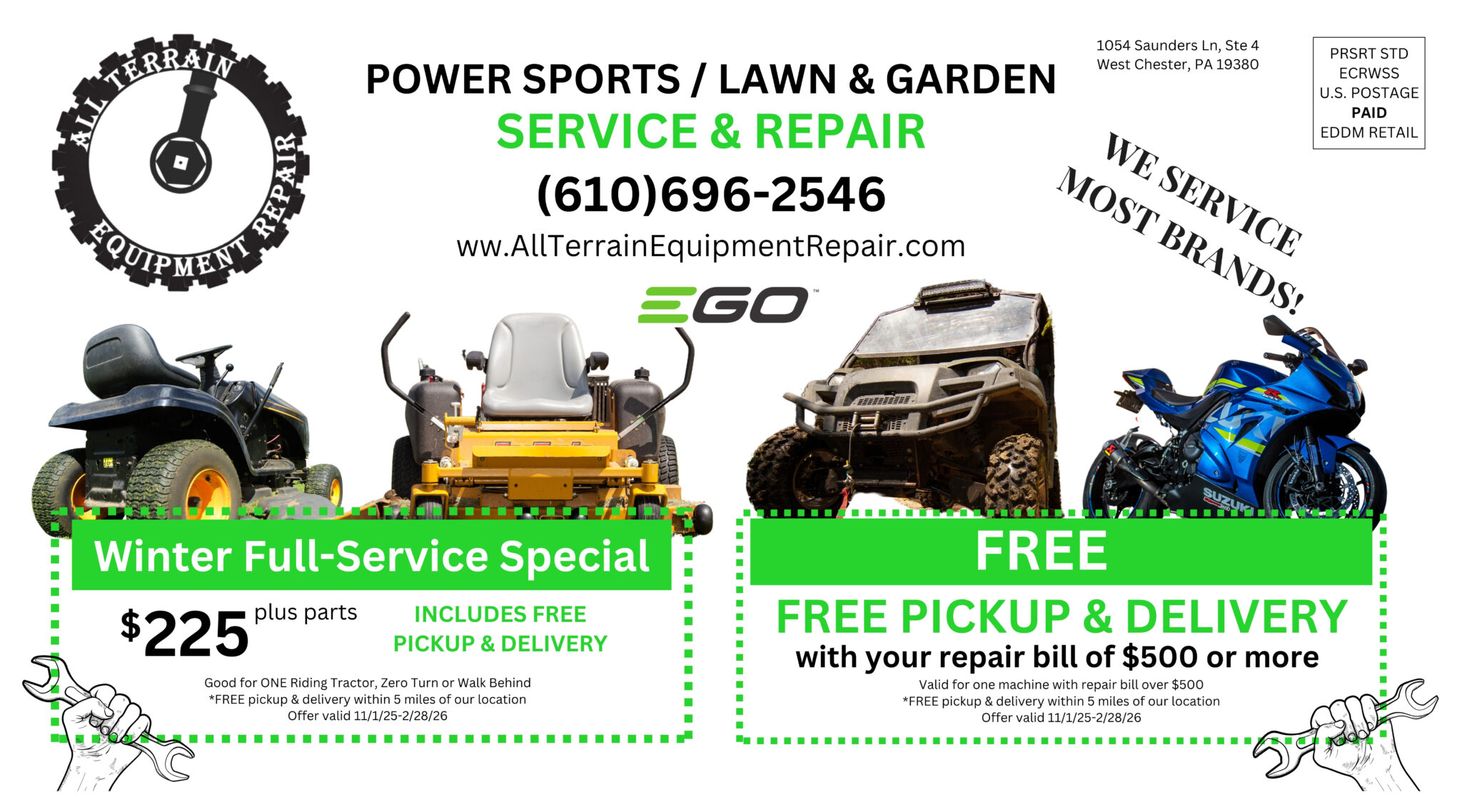 Looking for reliable Lawn & Garden or Motorcycle Repair near West Chester, PA? You’ve come to the right place. At All Terrain, we specialize in expert repair and maintenance for a wide range of power sports and lawn and garden equipment. For instance, we can help you with anything from the thrill of your next outdoor adventure to the satisfaction of a perfectly manicured lawn. Ultimately, we ensure your gear is always in peak condition.